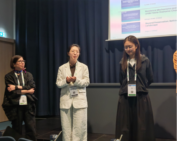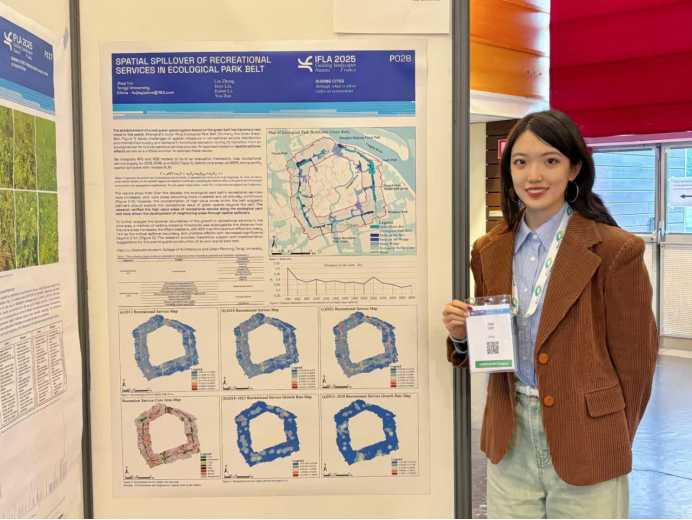 硕士生刘佳艺(指导老师:张琳副教授)以“The Functional Transformation of Green Belts: Research on Spatial Spillover of Recreational Services in Shanghai's Ecological Park Belt(张琳,刘佳艺,李佳蔚,左佑 Topic: Guiding cities through what is alive:cities as ecosystems)”为题进行海报展示。同时展示了王丹妮同学的海报“Identitying Landscape Features and Public Perception in Canal Village(王丹妮,左佑,张琳 Topic: Guiding territories with legislative and social advances in planning: Evolution of heritage landscapes)”