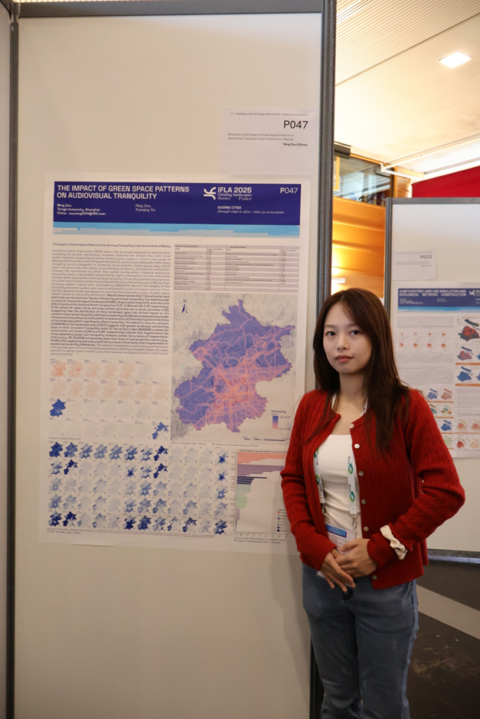 博士生邹宁同学(指导老师:许晓青副教授)以“Research on the Impact of Green Space Patterns on Audiovisual Tranquility in the Central Area of Beijing”为题进行海报展示。