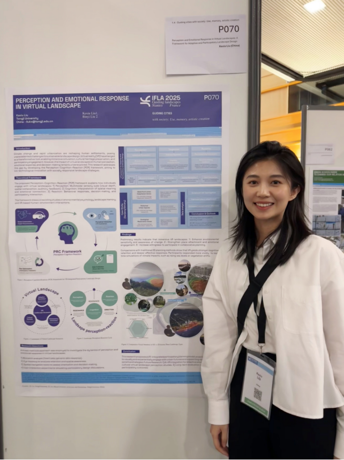 博士生刘珂秀(指导老师:刘滨谊教授)以“Perception and Emotional Response in Virtual Landscapes: A Framework for Adaptive and Participatory Landscape Design(Topic: Guiding cities with society: Use, memory, artistic creation)”为题进行海报展示。