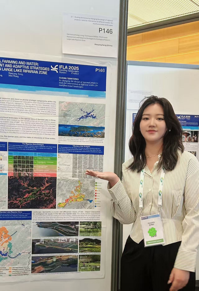 博士生宋昊洋(指导老师:王敏副教授)以“Harmony among Living, Farming and Water: Multi-scale Assessment and Adaptive Strategies for Ecological Risks in Large Lake Riparian Zone(Topic: Guiding territories by changing the design of regional projects: tools for intervention at different scales, for multifunctional landscapes)”为题进行海报展示。