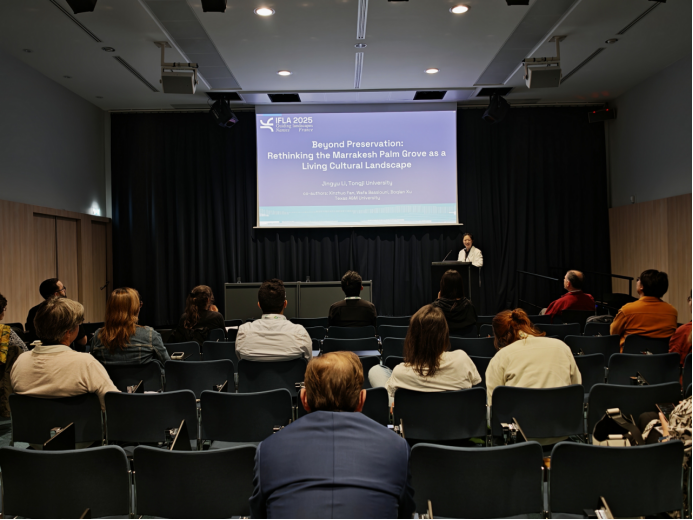 我系教师李璟昱在“立法与社会进步引导(遗产景观的演化)”(Guiding territories with legislative and social advances in planning (Evolution of heritage landscapes))分论坛发表了题为“超越保护:作为活态文化景观的马拉喀什棕榈林再思考”(Beyond Preservation: Rethinking the Marrakesh Palm Grove as a Living Cultural Landscape)的主题演讲,并在之后的圆桌讨论环节和在场专家学者进行交流。