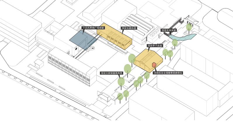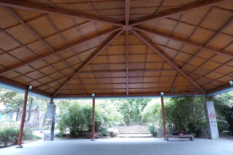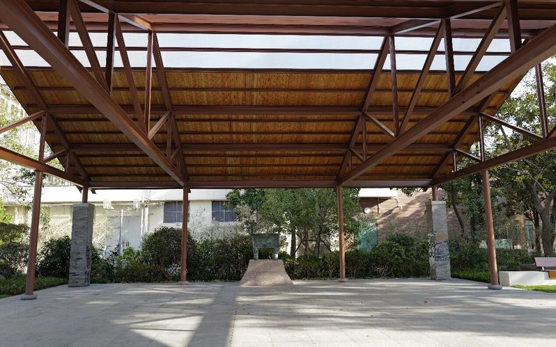 形态的转译:从“食堂屋架”到“亭宇新顶”,将现状四坡顶亭子改造为源自历史二食堂建筑的人字屋架两坡顶,并将原放置于绿化中的河南校友会捐赠青铜鼎(百年校庆时所捐)移位于亭下。亭子坡顶之上设置采光屋面,将自然光引入亭内,光线的介入象征着对历史空间的照亮与激活,使亭子从单纯的观景点转变为具有精神性的纪念与交流核心。