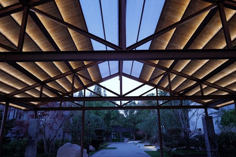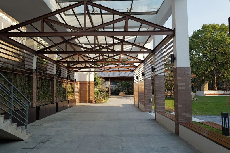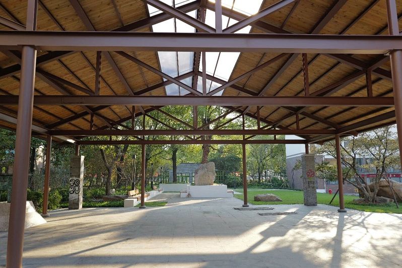 尺度的转换:从“建筑尺度”到“人体尺度”。在能源中心南侧的现状二层玻璃廊下架设人体尺度的人字形屋架,并栽植藤本月季,形成特色花廊。这是对“人字屋架”母题的第二次、也是更亲密的转译,藤本月季的引入为理性的历史记忆注入了浪漫、生长与芬芳的生命力,暗示着新的美好记忆正在旧的脉络上绽放。