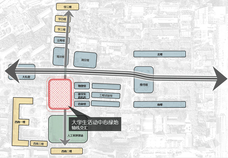 将基地置于同济大学四平路校区(本部)整体景观体系中进行分析定位,从基地位置看,其被大礼堂、西南一楼、人工草坪球场、物理科学与工程学院等建筑围合,是校园东西轴线和南北轴线的交汇点和人流中心,将会成为本部真正的校园活动中心。