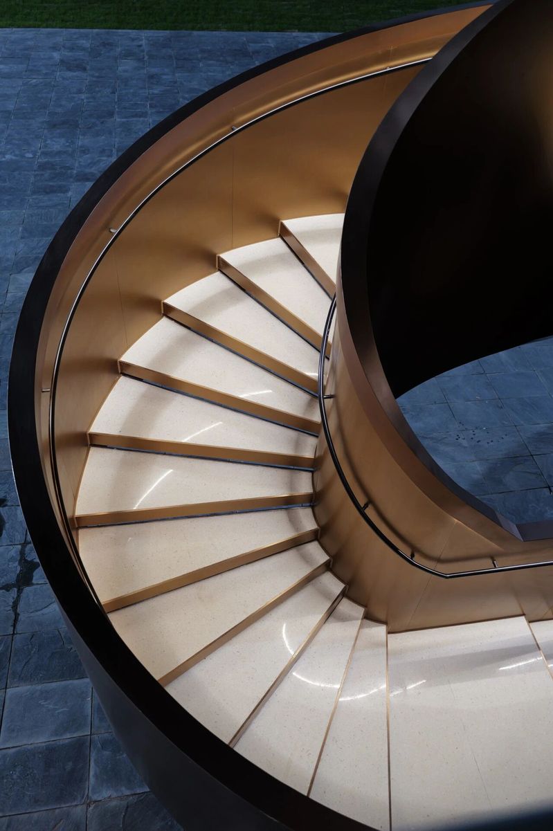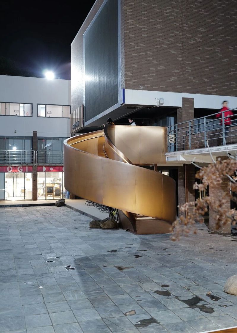 垂直维度的缝合:新增艺术化的旋转楼梯,在形成广场视觉焦点的同时,打通上层连廊与下层广场的物理阻隔,创造垂直方向的“看与被看”,丰富空间体验。