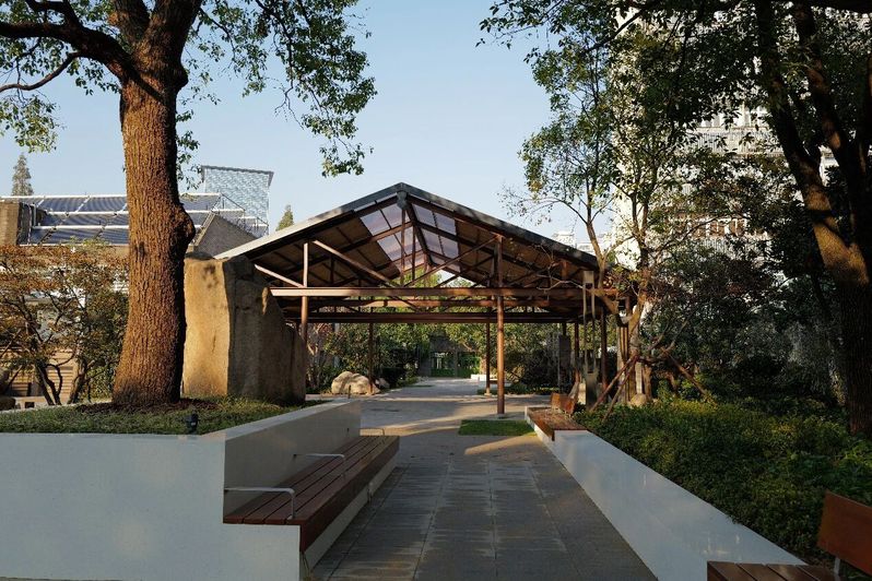 设计深刻回应了基地从“生活服务”到“精神家园”的文脉演变,以“空间连通”为核心策略重构场地秩序,激活集体记忆。为打破各个历史片段之间的孤立状态,建构了一条以现状亭子为核心枢纽的南北向连接通道,将散落的景观“锚点”与新建建筑有机串联,形成一条承载功能与情感的 “记忆与活力廊道”。