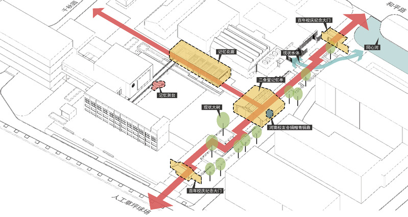 以亭子为中心建构南北主通道,保留百年校庆时建设的两个纪念性大门,形成贯通本部校园东西与南北两条轴线的交汇空间。通道从亭子向南,保留现状大树,通过场地竖向地形梳理、挡墙座椅设置、通道与场地组织,连接南入口大门与广场,形成舒朗的公园式林下空间。从亭子向北,以平桥跨越现状水体,并东联校园中心的同心河滨水绿带,结合依托能源中心的中水处理展示区,形成特色的水上场地。