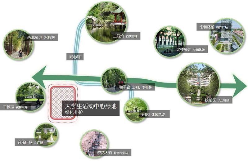而与校内其他景观场地对比分析看,校园内绿地形式多样,包括古典园林、入口轴线景观、纪念园、树阵广场、林荫大道等,但仍缺乏可为学生提供大型的绿化景观,基地所在区域无论位置、规模、场地环境等均具备作为校园中心的补位潜质。