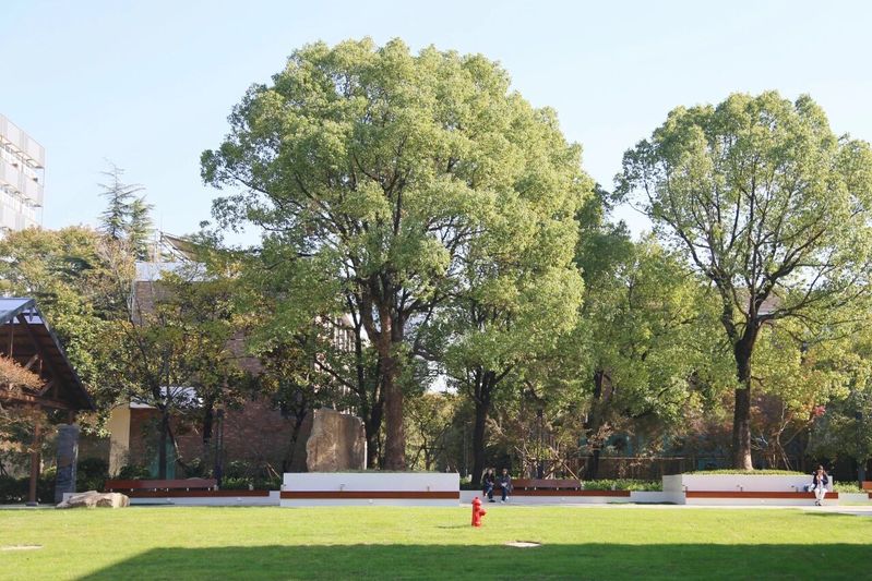 设计保留20年来历届同济学子举办各类活动的下沉式广场,以及基地内高达20多米的香樟、姿态丰盈的黄杨、造型别致的红枫等场地的时间见证者,锚固历史印记,将时间坐标得以延续,进而维系场地的稳定感与归属感。