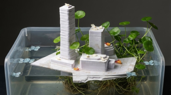 一座被遗忘的模型,在水中重生。它原本是废弃的城市残片,如今被水与植物重新包裹。水成了时间的载体,带着记忆的碎屑;植物沿裂缝上攀,如自然渗入人类秩序的缝隙。