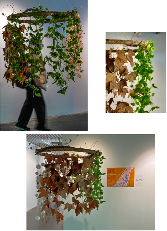 《Rust & Renewal》以“锈蚀与新生”为核心意象,表达万物在坠落、褪色与解体中不断走向更新的循环过程。作品将落叶、花朵、绿色植物与金属网、锈迹并置呈现,并非为了对比衰败与美丽,而是强调二者之间的相互滋养。落叶的腐化为新生提供养分,锈迹的蔓延则让人造材料重新回归大地。在看似破败的表面之下,新的绿色正在悄然生长。作品通过“枯萎—锈蚀—萌发—绽放”的温和循环,隐喻自然与生命在失去、沉淀与重建中的持续更新。
