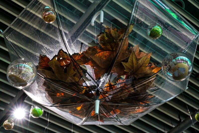 《覆载之间》是一个探索城市代谢困境的象征性装置。它以倒置的伞为核心,向上敞开的伞面承载落叶,喻示人类活动造成的生态淤塞;其下悬垂的透明球体内,新叶悄然萌发,构成一组倒置的“呼吸”系统。装置邀请观众走入伞下,被迫仰视由废弃物构成的“苍穹”,而新生如星辰垂落眼前。这不仅是视角的翻转,更是一次对循环与重生的沉思:我们能否在自身制造的负重下,将废弃之地转化为生命孵化的空间?