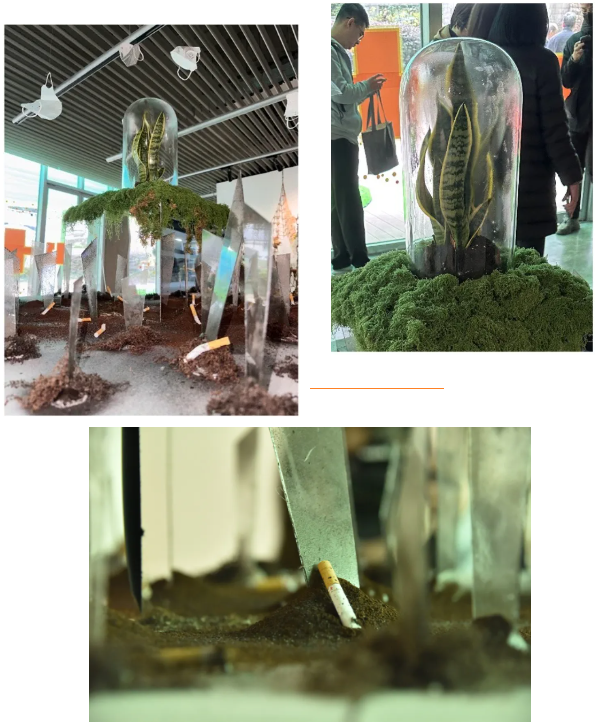 基层包含破碎的丙烯酸片、废弃的香烟过滤器、涂抹在表面的深色墨水和悬挂的用过的口罩。这些因素代表了污染、有害习惯和漫不经心的日常行为,这些行为会慢慢窒息我们所依赖的空气。尖锐的碎片向上刺穿,说明了不作为的后果。中心周围的镜面不仅投射出无尽的锐利感,还要求观众看到自己反映在被污染的景观中,强调分担责任和个人影响。