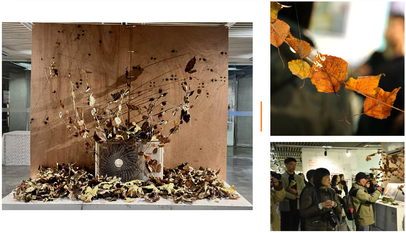 作品以绿叶代表舒适和充满活力秩序的环境,用枯叶代表自然界的生物凋零和愈发混沌难以预测的极端灾害。外机运行吐出的熵增带来的混乱积累、卷积,最后击穿墙壁,反噬内机为人类塑造的小小恒温房。