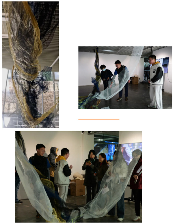 作品以垂直叙事构建生态史诗:顶端金、蓝、棕三色网交织,象征生命、海洋与土地的共生;中段白色网格撕裂和谐,而粗糙金绳以笨拙而坚韧的姿态缝补破碎,呈现从“困境”到“破局”的激烈过程。