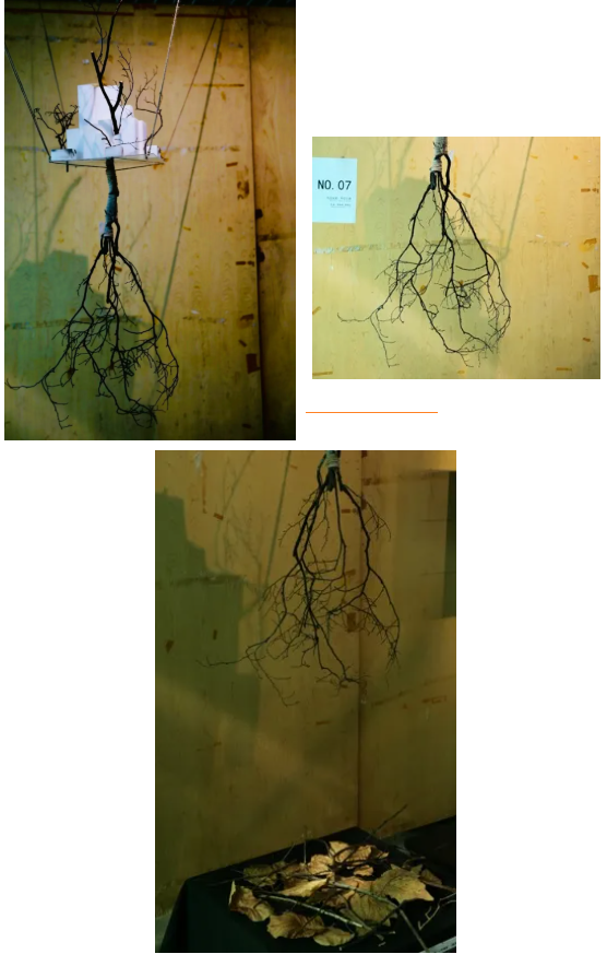 悬浮装置下的黑布桌面上散落着枯叶与断枝,那些看似随意的落物,是“新生”最真实的证据:它们象征自然循环中的剥落、腐败与更新,也象征每一次再野化的痕迹。这一层表明,生态重构不是从城市中心开始,而是从被忽视的边缘与残留开始。